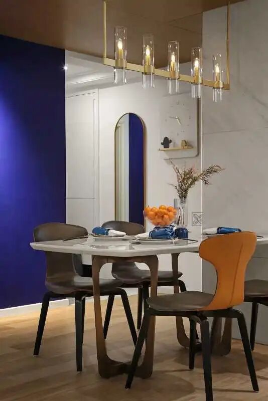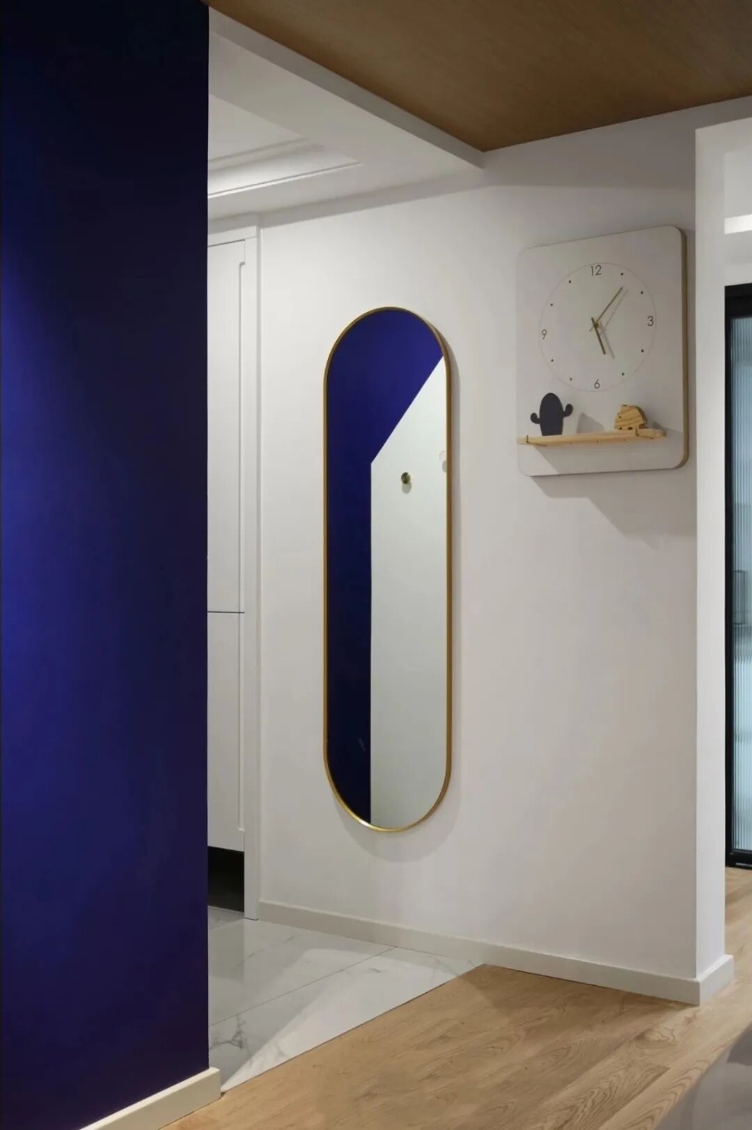 进门,深蓝色黑板漆在白墙的映衬下,加上镜面的金属框,愈加出彩!