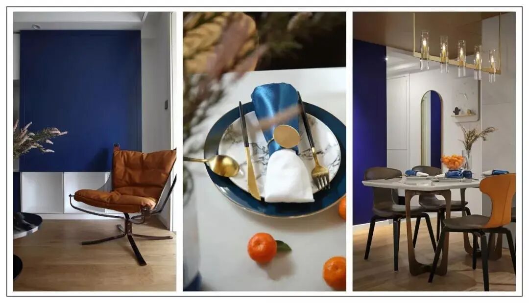 客厅开放式的设计,开阔了视野,整体的色调为白色+蓝色+木色,几种颜色的碰撞营造出前卫的时尚感!