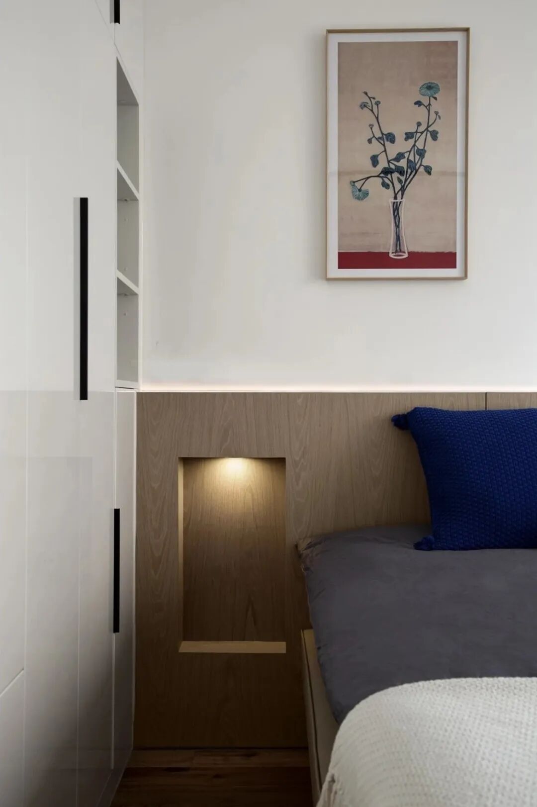 主卧空间满足衣柜后,放两个床头柜就会无法走路和打开柜门,靠近床头处上下分体的衣柜设计更加人性和实用,床头背景设计以宅男在线视频新款高级灰地板为主色调,并参考壁龛的做法,内嵌两个位置方便摆放手机等小物品,考虑多种可能性,色泽搭配,既高级又实用,地板处处都能实现以“人”为本的装饰风格。